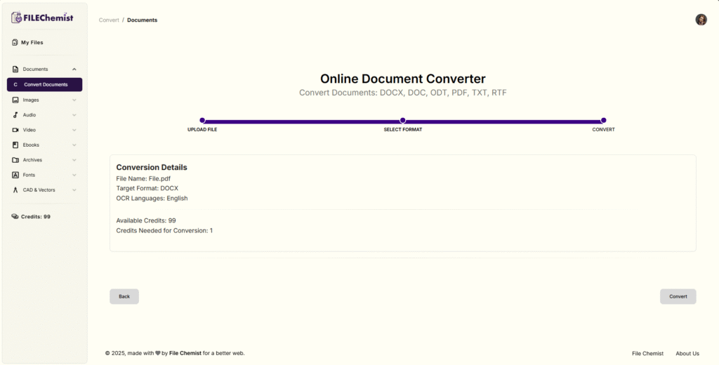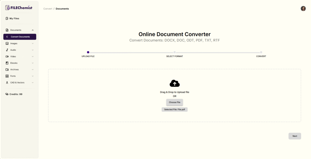 Seamlessly convert your files in seconds or minutes with File Chemist โ the fastest, easiest, and most powerful online file conversion tool. No software, no hassle – just pure conversion magic